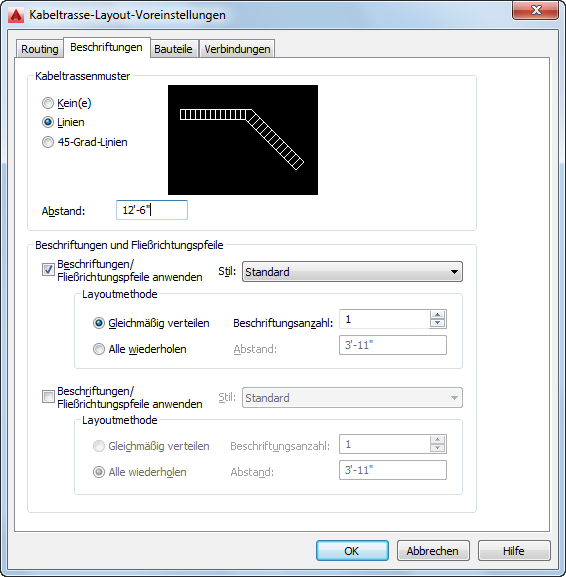 Sie können Beschriftungen oder Fließrichtungspfeile angeben, die während des Zeichnens zu Kabeltrassenstrecken hinzugefügt werden. Außerdem können Sie das anzuwendende Schraffurmuster angeben. Sie können vertikale oder diagonale Linien und den zu verwendenden Linienabstand angeben.