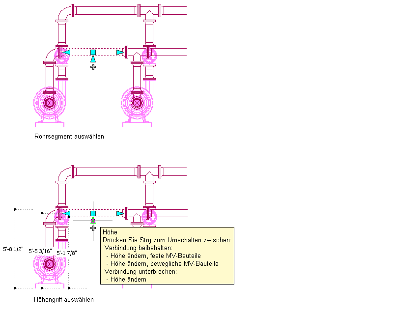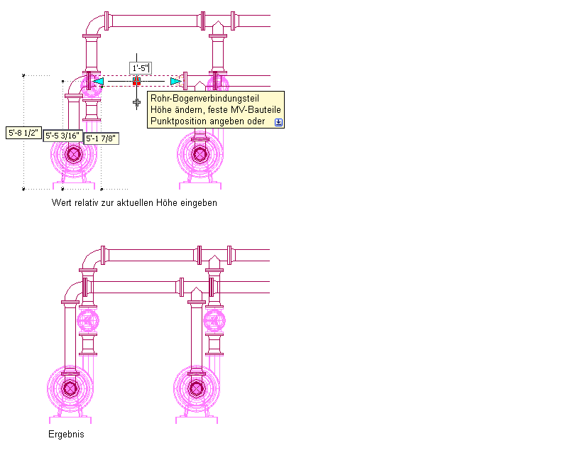 Im folgenden Beispiel wurde die Höhe eines Rohrsegments geändert. Um die Zugänglichkeit der Ventil-Handräder zu verbessern, wird ein horizontales Rohrsegment relativ zu seiner aktuellen Höhe angehoben. Die Software passt die angeschlossenen Objekte an, um die Verbindung beizubehalten.