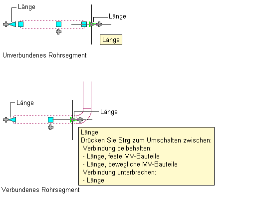) ändern. Längengriffe beschränken ein Segment auf den aktuellen Winkel. Dies ist besonders hilfreich beim Verlängern von Rohrsegmenten, die bereits eingefügt sind.