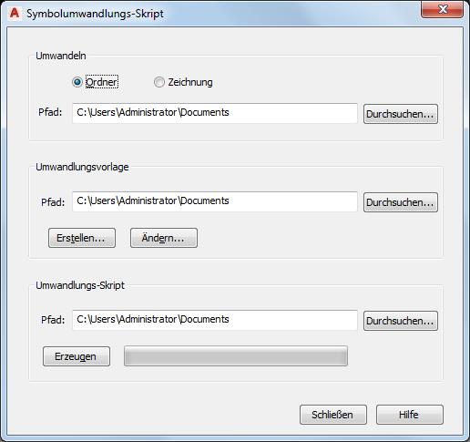 | Umwandeln der Blöcke in allen Zeichnungen in einem Ordner | Wählen Sie Ordner, klicken Sie auf Durchsuchen, wählen Sie den Ordner aus und klicken Sie auf OK. |