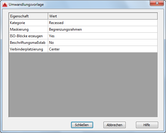 | Verwenden einer bestehenden Vorlage | Klicken Sie auf Durchsuchen. Wählen Sie im Feld Datei öffnen die gewünschte Vorlage und klicken Sie auf Öffnen. Anmerkung: Wenn Sie Änderungen an der Vorlage vornehmen möchten, bevor Sie sie verwenden, klicken Sie auf Bearbeiten. Nehmen Sie im Dialogfeld Umwandlungsvorlage die nötigen Änderungen an den Werten für die Einstellungen in der Vorlage vor. Klicken Sie auf Schließen, um zum Dialogfeld Symbolumwandlungs-Skript zurückzukehren.