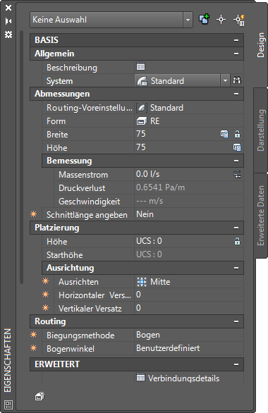 | Routing-Voreinstellung | Wählt eine Routing-Voreinstellung für das Luftkanal/-rohr-Objekt in der aktuellen Zeichnung aus | Standard (Standardeinstellung); Optionen aus dem Katalog |