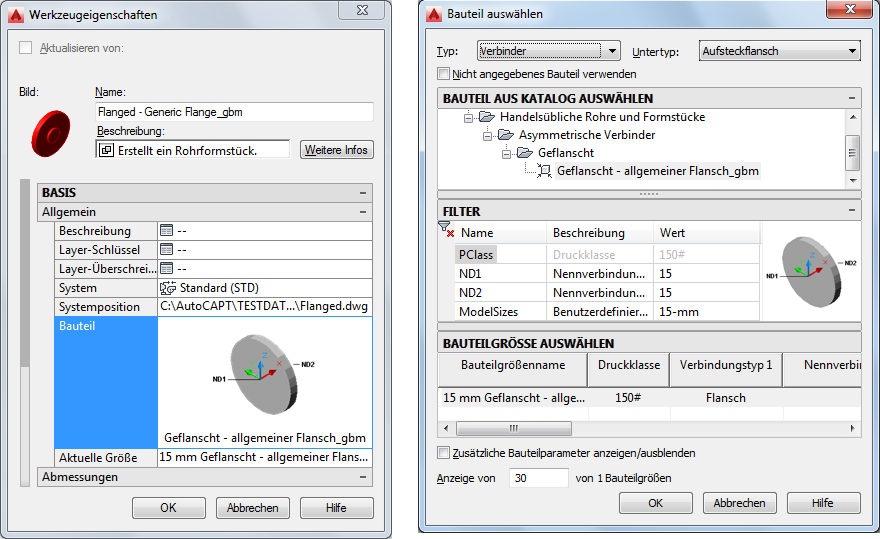 Tipp: Wählen Sie die Option zum Verwenden des unspezifizierten Bauteiltyps, um die Bauteilauswahl in diesem Dialogfeld zu deaktivieren. Mit dieser Auswahl wird in der Werkzeugpalette ein Werkzeug ohne spezifische Eigenschaften erstellt. Sie können das neue Werkzeug während des Layouts der Rohrstrecke zum Aufrufen des Befehls Rohrformstück hinzufügen für das Objekt verwenden.