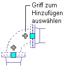 Mit Griffen zum Hinzufügen können Sie auf einigen Formstücken einen neuen Abzweig direkt vom Formstück erstellen. Beispielsweise können Sie beim Zeichnen einer Rohrstrecke mit einem Griff zum Hinzufügen auf einem Bogen den Bogen in ein T-Stück umwandeln. Die vorhandenen Rohrabzweige bleiben verbunden.
