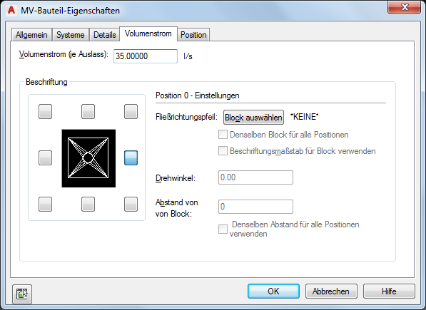 Bis zu acht Positionen für Fließrichtungspfeile am Luftauslass können angegeben werden. Es ist möglich, den Block für den Fließrichtungspfeil auszuwählen und optional denselben Block für alle Fließrichtungspfeile zu verwenden oder verschiedene Blöcke je nach Position auswählen. Sie können den Drehwinkel und den Abstand zum Luftauslass für jeden Fließrichtungspfeil und einen Wert für den Fluss angeben.