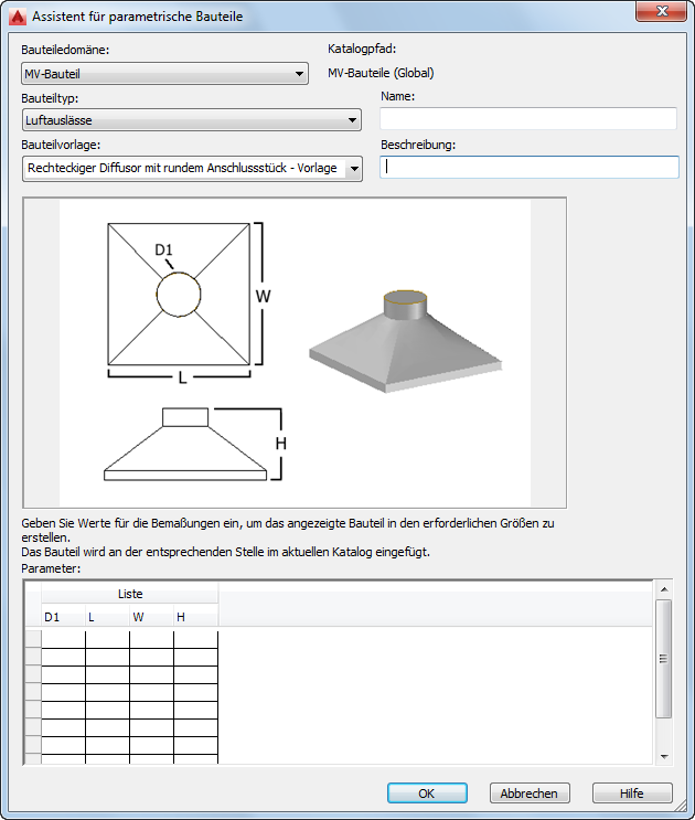 Parametrische Bauteile mit dem Assistenten zu erstellen, ist dann zu empfehlen, wenn Sie nur ein grundlegendes Modell für die Darstellung des Bauteils benötigen. Der Assistent ist insbesondere zum Erstellen von Bauteilen mit einer oder einigen wenigen Größen in Echtzeit beim Entwerfen eines Gebäudesystems praktisch.