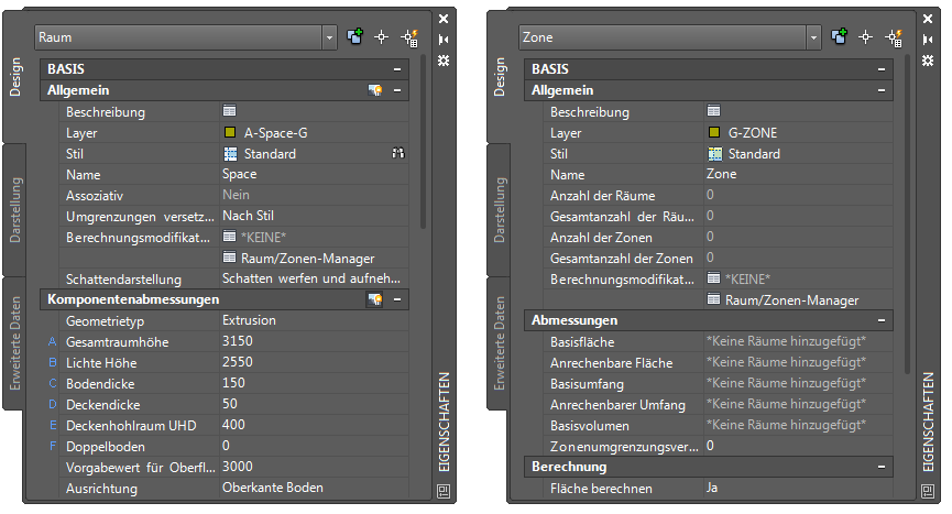 - Um die Berechnungen anzuzeigen, klicken Sie auf einen Raum oder eine Zone und wählen Sie in der Eigenschaftenpalette die Registerkarte Erweiterte Daten.