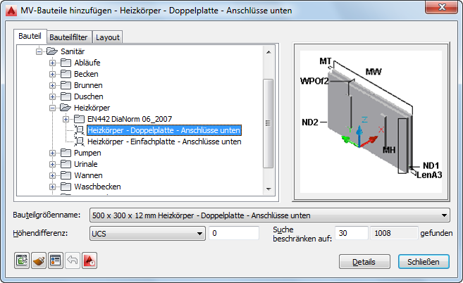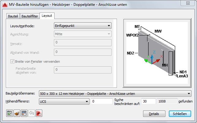 . Sie können einen Bauteilgrößennamen für den Heizkörper auswählen oder in der Software die geeignete Bauteilgröße auf der Registerkarte Layout berechnen (im Folgenden beschrieben).