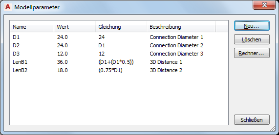 - Zum Ändern des Standardwerts oder zum Angeben eines berechneten Werts für die Länge der Hauptleitung und der Verzweigung erweitern Sie die Modellparameter, klicken mit der rechten Maustaste auf eine Längenbemaßung und wählen Bearbeiten.