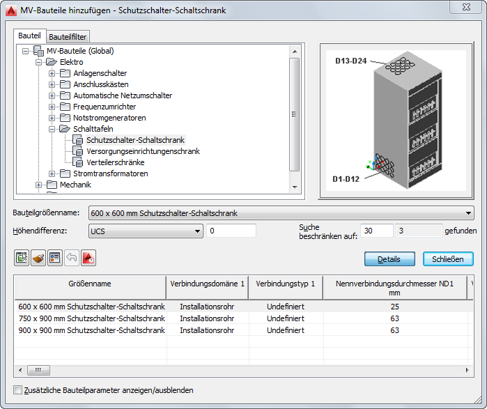 - Klicken Sie auf Details, um die verfügbaren Größen des gewählten Bauteiluntertyps anzuzeigen.