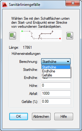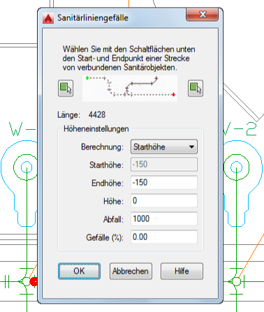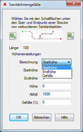 Klicken Sie im Dialogfeld Sanitärliniengefälle auf Startpunkt der Strecke wählen oder auf Endpunkt der Strecke wählen.