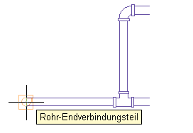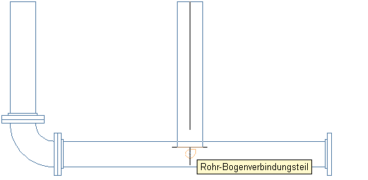 Beim Zeichnen eines Rohrs können Sie mit Rohrfängen ein Rohr, Formstück oder MV-Bauteil direkt mit einem Rohr-Endverbinder am Ende des Rohrsegments verbinden. Sie können auch eine Verbindung mit Rohr-Bogenverbindern an einer beliebigen Stelle des Rohrsegments erstellen.