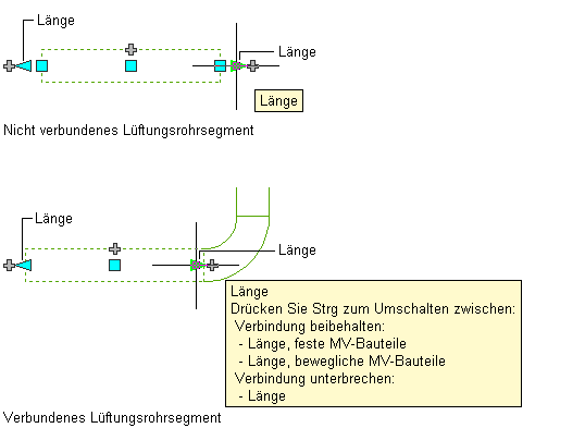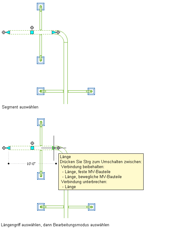 Wenn Sie den Längengriff an einem Ende verwenden, das mit einem anderen Objekt verbunden ist, müssen Sie angeben, ob Sie möchten, dass AutoCAD MEP beim Ändern der Länge die Verbindung zwischen den Objekten beibehält.