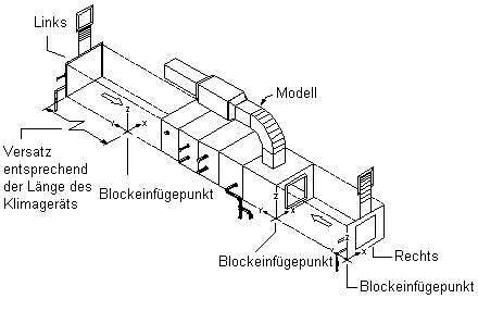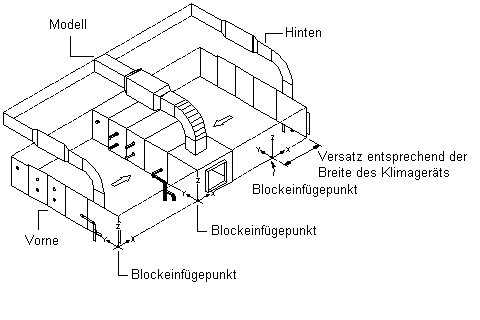 Die obigen Abbildungen zeigen den Einfügepunkt der Modellansicht als untere rechte Ecke der Vorderseite. Die Ansichten von oben und unten verwenden den rechten Eckpunkt der Vorderseite als Einfügepunkt, wobei der Einfügepunkt der Ansicht von oben um die Höhe des Lüftungsgeräts versetzt ist. Die Ansichten von vorne und hinten verwenden den rechten Eckpunkt der Unterseite als Einfügepunkt, wobei der Einfügepunkt der Ansicht von hinten um die Breite des Lüftungsgeräts versetzt ist. Die Ansichten von links und rechts verwenden den unteren vorderen Eckpunkt als Einfügepunkt, wobei der Einfügepunkt der Ansicht von links um die Länge des Klimageräts versetzt ist.