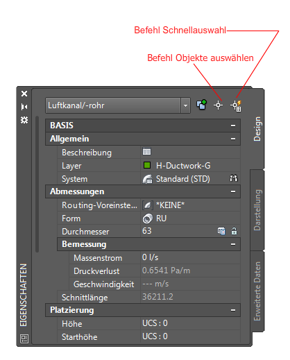 Beispiel auf der Luftkanal/-rohr-Eigenschaftenpalette