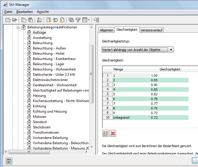 Jeder Gleichzeitigkeit ist ein Wert zugewiesen, der mit der Belastung multipliziert wird, um die Bedarfslast für eine Belastungskategorie festzustellen. Es ist wichtig, eine Bedarfslast festzulegen, um den Schaltkreis nicht zu überlasten. Wenn Sie einen Gleichzeitigkeitsfaktor definieren, erhalten Sie auch eine reale Berechnung der geschätzten Bedarfslast.