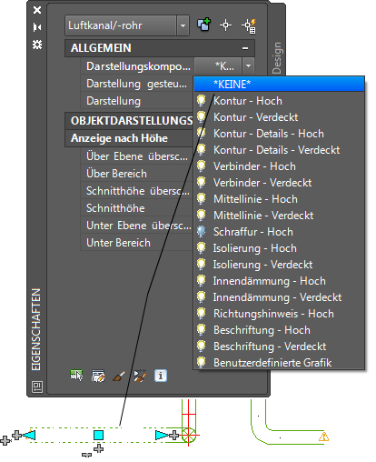 Sie können diese Darstellungskomponenten konfigurieren, um die folgenden AutoCAD MEP-Objekte relativ zum Grundriss und der Schnittebene ein- bzw. auszublenden: