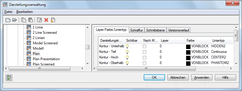 Durch die Darstellungseinstellungen werden Objekte oberhalb oder unterhalb des Anzeigebereichs unterschieden. Beispielsweise können Sie Linientypen und Linienfarben festlegen, um je nach Höhe eine unterschiedliche Anzeige zu ermöglichen. Außerdem können Sie mithilfe der Darstellungseinstellungen ein Objekt basierend auf der Höhe ausblenden. Das Ausblenden von Objekten ist hilfreich, wenn Sie Werkpläne für einen bestimmten Grundriss von einem über mehrere Stockwerke reichenden Modell erstellen.
