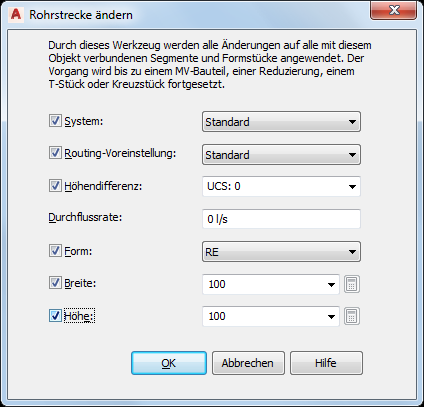 Dialogfeld Rohrstrecke ändern (für Luftkanal/-rohr)