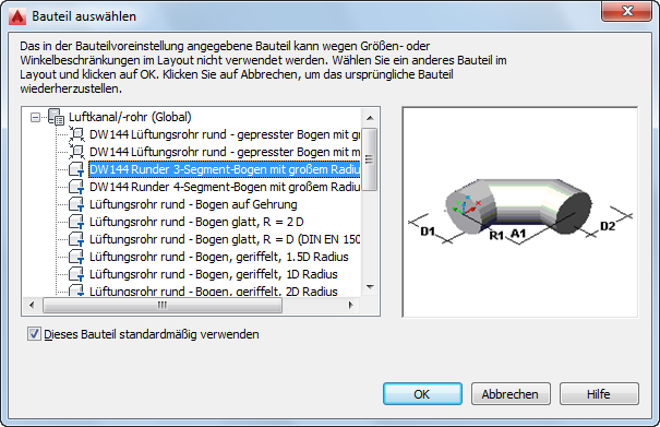 Das Dialogfeld Bauteil auswählen wird angezeigt, wenn Sie in einer Strecke ein Bauteil hinzufügen oder ändern möchten, das nicht in den Voreinstellungen gespeichert ist. Sie werden aufgefordert, ein anderes Bauteil aus dem Katalog auszuwählen. Das folgende Beispiel zeigt das Dialogfeld in der Domäne Luftkanal/Luftrohr im Profil Global: