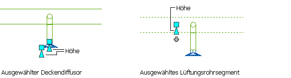), um die Höhe der Lüftungs-MV-Bauteile und Luftkanal/-rohr-Segmente beim Verbinden mit vorhandenen Luftkanal/-rohr-Strecken in Seiten- und isometrischen Ansichten zu ändern. Höhengriffe werden auf Lüftungs-MV-Bauteilen an den Einfügepunkten und Verbindungspunkten angezeigt. Mit den Höhengriffen eines Luftkanal/-rohr-Segments können Sie die Höhe relativ zur Oberkante, Mittellinie oder Unterkante des Segments ändern.