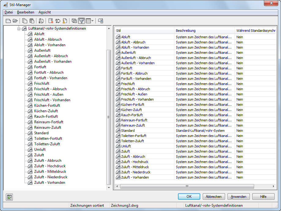 Systems werden über AutoCAD MEP-Vorlagen geladen. Wenn Sie keine AutoCAD MEP-Vorlage verwenden, können Sie über den Stil-Manager Systemdefinitionen aus anderen Zeichnungen importieren. Weitere Systemdefinitionen sind in der Datei System Definitions.dwg zu finden, die sich in einem Unterordner des folgenden Verzeichnisses befindet: \ProgramData\Autodesk\MEP <Version>\deu\Styles.