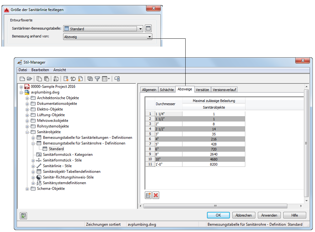 Wenn Sie die Sanitärstrecke als Abzweig definieren, führt die Software die Bemessungsberechnungen anhand der Daten auf der Registerkarte Abzweige in der Sanitärlinien-Bemessungstabelle (Rohrbemessungstabelle) aus, deren Definitionen im Stil-Manager zu finden sind.