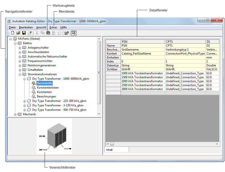 Im Vorschaubereich links unten im Katalog-Editor wird das Teil als gerendertes dreidimensionales Bild (3D) dargestellt. Parameter, die das Bauteil definieren, werden als Bemaßung bezeichnet.