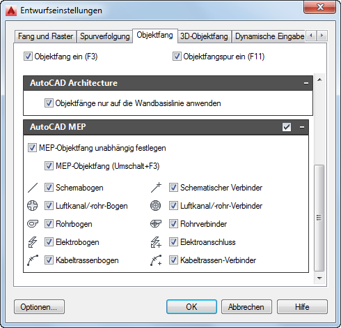 - Klicken Sie im Dialogfeld Entwurfseinstellungen auf die Registerkarte Objektfang, und blättern Sie bis zu AutoCAD MEP.