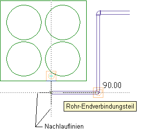 Sie können eine Rohrstrecke mit einem MV-Bauteil verbinden. Überprüfen Sie in diesem Fall den Verbindungstyp und die Größe auf dem MV-Bauteil, damit Sie die Routing-Voreinstellung und Rohrgröße entsprechend angeben können. Sie können auch manuell ein Bauteil angeben, um eine Strecke an ein MV-Bauteil anzuschließen.