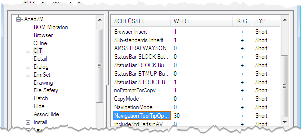 Im System-Editor im Zweig Acad/M > CIT steuert der Schlüssel NavigationToolTipOpacity die Transparenz der QuickInfo. In diesem Schlüssel wird der Prozentsatz der Transparenz angegeben. 100 bedeutet, dass die QuickInfo undurchsichtig ist, während bei 0 die QuickInfo unsichtbar ist.