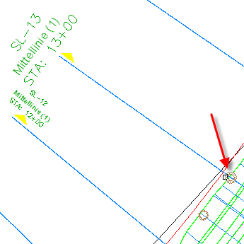 Beachten Sie im oberen Ansichtsfenster, dass ein Strommastenblock im Querprofilplan 13+00.00 nicht angezeigt wird. In diesem Querprofilplan werden keine Strommastenblöcke angezeigt, da keiner innerhalb von 50 Fuß vor oder nach der Querprofillinie vorhanden ist.