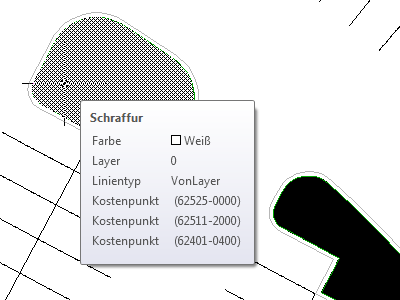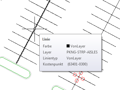 In der Parkplatzinsel wird eine kompakte Schraffur angezeigt. Dies gibt an, dass die Kostenpunkte auf den Bereich angewandt wurden.