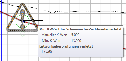 Wenn ein Längsschnitt-Teilobjekt gegen ein Kriterium oder eine Entwurfsüberprüfung verstößt, wird im Zeichnungsfenster, in der Ansicht Längsschnittobjekte und im Dialogfeld Entwurfsparameter (Längsschnitt) ein Warnsymbol für das Teilobjekt angezeigt. Wenn Sie mit der Maus auf das Warnsymbol zeigen, wird eine QuickInfo mit Informationen zu dem Verstoß eingeblendet. Falls gegen ein Entwurfskriterium verstoßen wurde, finden Sie in der QuickInfo das betreffende Kriterium und den Mindestwert, der erfüllt werden muss. Falls gegen eine Entwurfsüberprüfung verstoßen wurde, enthält die QuickInfo den Namen der betreffenden Entwurfsüberprüfung.