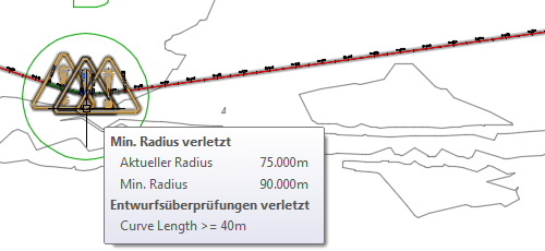 Wenn ein Teilobjekt ein Kriterium oder eine Entwurfsüberprüfung verletzt, wird im Zeichnungsfenster, in der Ansicht Achsobjekte und im Dialogfeld Achsobjekt-Parameter ein Warnsymbol für das Teilobjekt angezeigt. Wenn sich der Mauszeiger über einem Warnsymbol im Zeichnungsfenster befindet, werden in einer QuickInfo Informationen über den Verstoß angezeigt. Wenn gegen ein Entwurfskriterium verstoßen wurde, wird dieses in der QuickInfo angezeigt. Außerdem wird der Mindestwert angezeigt, der zum Erfüllen des Kriteriums notwendig ist. Falls eine Entwurfsüberprüfung verletzt wurde, enthält die QuickInfo den Namen der betreffenden Entwurfsüberprüfung.