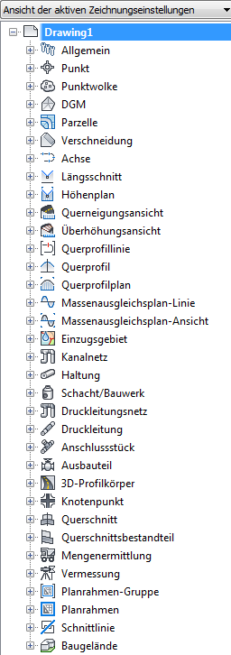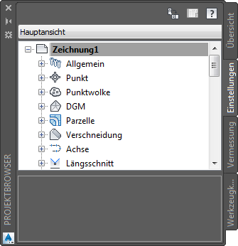 Auf der Registerkarte Einstellungen können Sie Stile für AutoCAD Civil 3D-Objekte verwalten und Einstellungen für Zeichnungen und Befehle steuern.