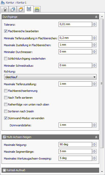 Bei nicht exakt vertikalen Flächen interpoliert Inventor HSM zwischen den Werten für axiales (unteres) und radiales Rohteil-Aufmaß, sodass das in radialer Richtung auf diesen Flächen verbleibende Rohteilmaterial je nach Flächenneigungswinkel und Wert für axiales Rohteil-Aufmaß vom angegebenen Wert abweichen könnte.