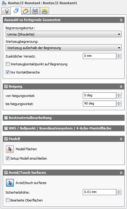 Gibt die zu vermeidenden Flächen an. Bei aktivierter Option verlaufen die Werkzeugwege in einem festgelegten Abstand zu den ausgewählten Oberflächen.