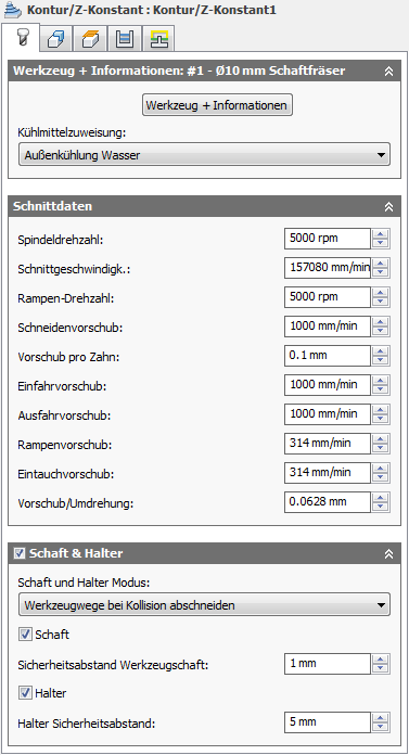 Bei Verwendung eines Werkzeugs mit Halter können Sie, je nach der Bearbeitungsstrategie, zwischen fünf verschiedenen Schaft/Halter-Modi wählen. Kollisionsbehandlung kann sowohl für den Schaft als auch den Halter des Werkzeugs erfolgen, und es können jeweils eigene Sicherheitsabstände eingestellt werden.