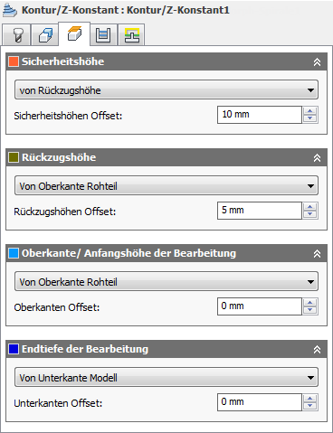 Mit der Rückzugshöhe wird die Höhe festgelegt, zu der das Werkzeug nach oben verschoben wird, bevor die nächste Schnittbewegung erfolgt. Der Wert für die Rückzugshöhe muss über dem Wert für Vorschubhöhe und Oberkante liegen. Die Rückzugshöhe wird zusammen mit dem nachfolgenden Versatz zum Festlegen der Höhe verwendet.