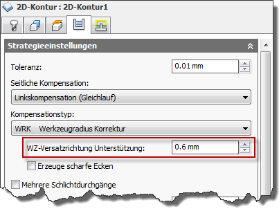 Beachten Sie, dass scharfe Ecken in der ausgewählten Geometrie durch diese Zugabe gerundet werden. Daher sollte der Parameter nicht höher als nötig festgelegt werden. Die Rundung ist jedoch in manchen Fällen durchaus erwünscht, da die Maschine an diesen Ecken einen höheren Vorschub beibehalten kann.