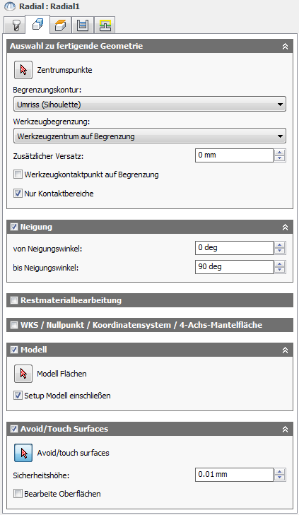 Gibt die zu vermeidenden Flächen an. Bei aktivierter Option verlaufen die Werkzeugwege in einem festgelegten Abstand zu den ausgewählten Oberflächen.