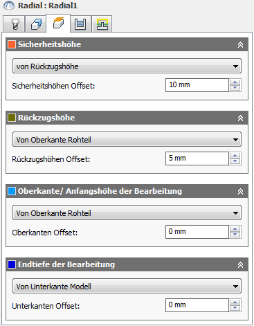 Mit der Rückzugshöhe wird die Höhe festgelegt, zu der das Werkzeug nach oben verschoben wird, bevor die nächste Schnittbewegung erfolgt. Der Wert für die Rückzugshöhe muss über dem Wert für Vorschubhöhe und Oberkante liegen. Die Rückzugshöhe wird zusammen mit dem nachfolgenden Versatz zum Festlegen der Höhe verwendet.