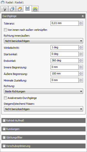 Die Durchgänge können in einem Zickzack-Muster zwischen dem äußeren und inneren Radius verknüpft werden, welches von innen nach außen oder von außen nach innen verlaufen kann, oder sie können automatisch aufgeteilt werden, wenn steigende oder stechende Fräsdurchgänge durchgeführt werden sollen.
