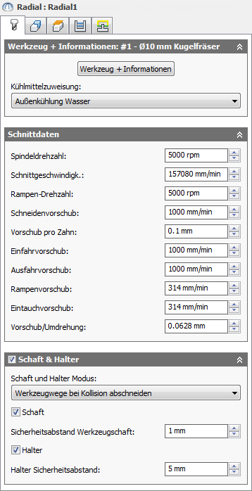 Bei Verwendung eines Werkzeugs mit Halter können Sie, je nach der Bearbeitungsstrategie, zwischen fünf verschiedenen Schaft/Halter-Modi wählen. Kollisionsbehandlung kann sowohl für den Schaft als auch den Halter des Werkzeugs erfolgen, und es können jeweils eigene Sicherheitsabstände eingestellt werden.