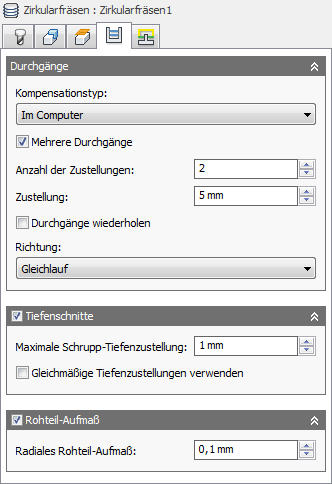 - Ist Verwendung gleichmäßiger Zustellungen deaktiviert, erhalten Sie wieder drei Durchläufe, bei denen der erste Wert jedoch -10 mm, der zweite -20 mm und der dritte -23 mm beträgt.