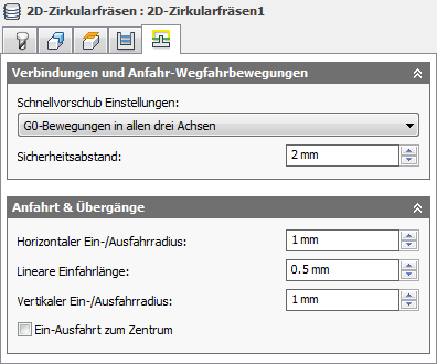Der Radius des vertikalen Bogens zum Glätten der Einfahrbewegung, wenn diese zum Werkzeugweg selbst erfolgt