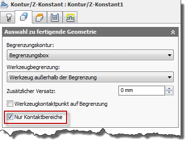 Die meisten 3D-Schlichtstrategien in Inventor HSM (Kontur, Parallel etc.) haben auf der Registerkarte Geometrie die Einstellung Nur Kontaktbereiche.