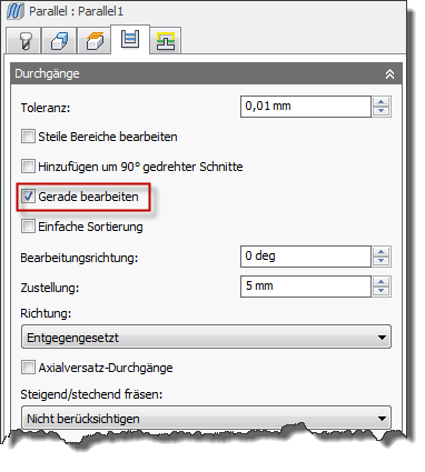 Wenn diese Option aktiviert ist, werden zwei parallele Operationen erzeugt, eine entlang der angegebenen Durchgangsrichtung und eine lotrechte (um 90 Grad gedreht). Die zwei Richtungen werden dann so zugeschnitten, dass für jeden angegebenen Bereich nur die Bearbeitungsrichtungen quer über die geneigten Bereiche hinweg verbleiben.