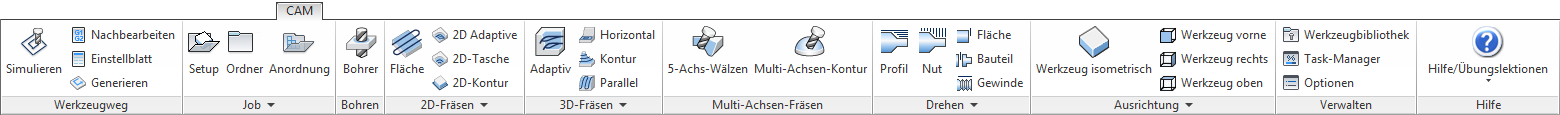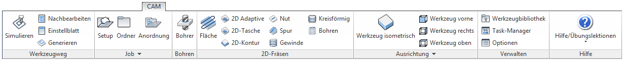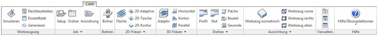 Sobald eine Bauteil- oder Baugruppendatei geladen und eine Strategie aus der CAM-Multifunktionsleiste ausgewählt wurde, wird der CAM-Browser aktiv und ersetzt den vertrauten Modell-Browser von Inventor. Im CAM-Browser können Sie alle für die Bearbeitung relevanten Daten des aktuellen Bauteils bzw. der aktuellen Baugruppe anzeigen und ändern.